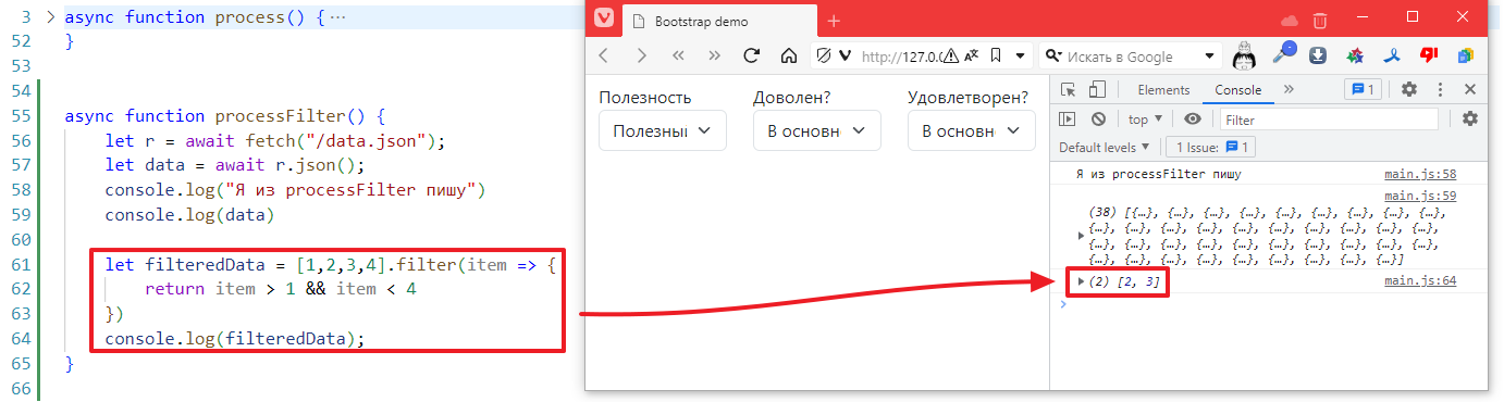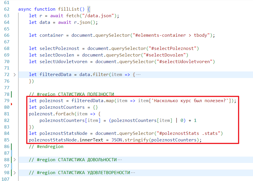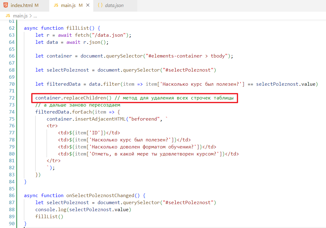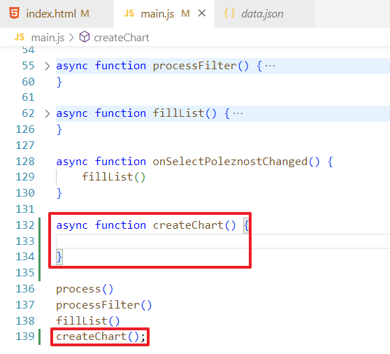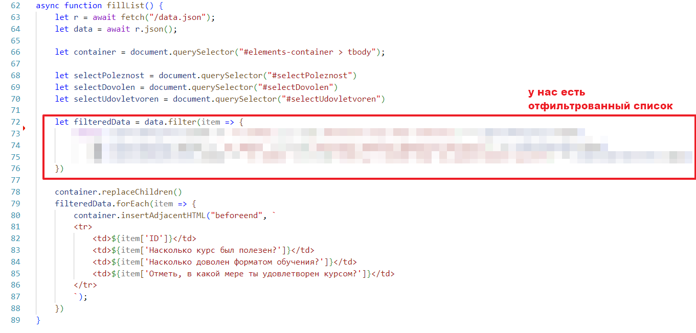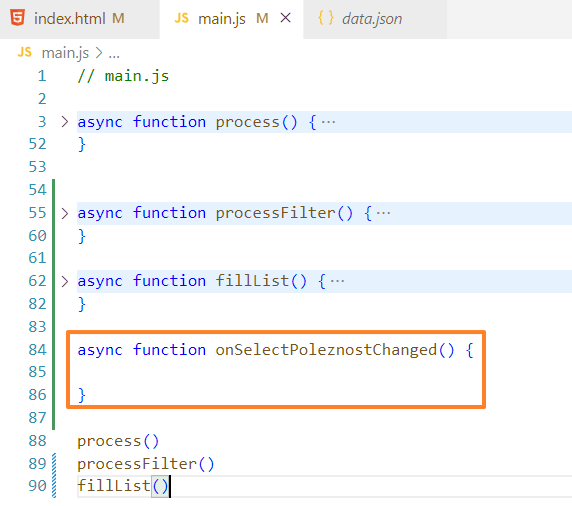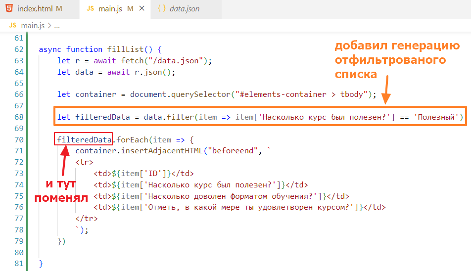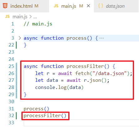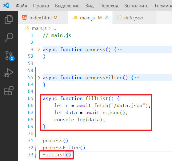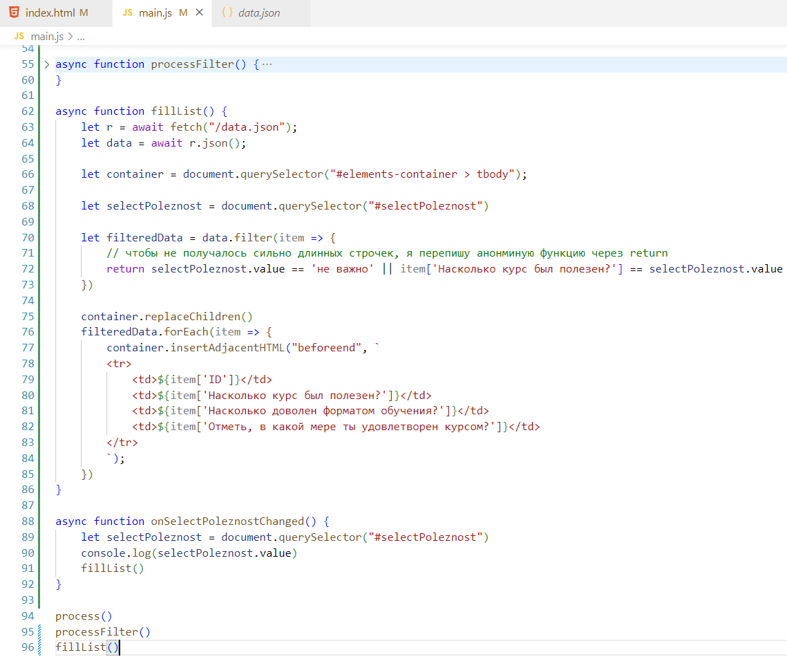 Чтобы не ломать код, которые был сделан в прошлом задании, я создам новую функцию в main.js и назову ее processFilter, запихаю в нее стягивание списка данных, вот так: