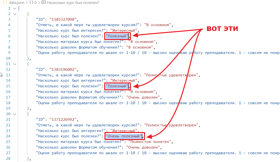я хочу запросить список отзывов, в которых отметили для ключа "Насколько курс был полезен?" значение "Полезный"