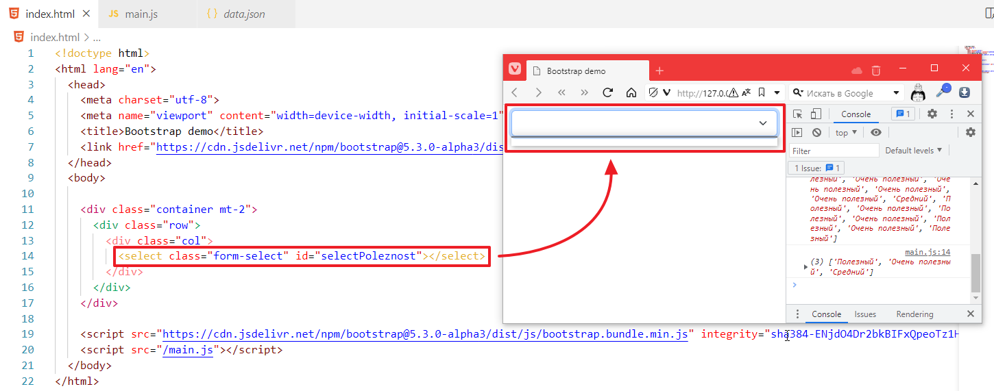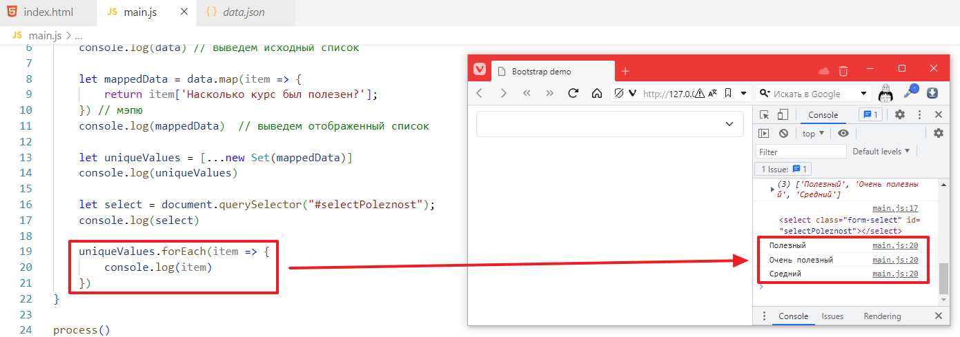 А теперь надо его заполнить. Заполняем, как и выпадающий список в прошлом задании через forEach.