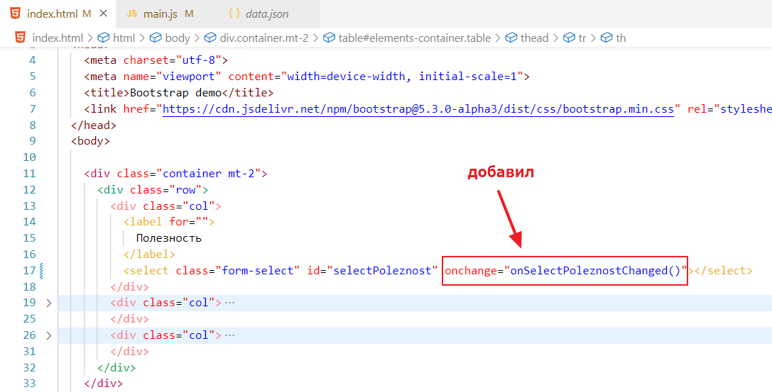 теперь пойдем в index.html и привяжем эту функцию в качестве обработчика события смены значения в списке. Делается это так: