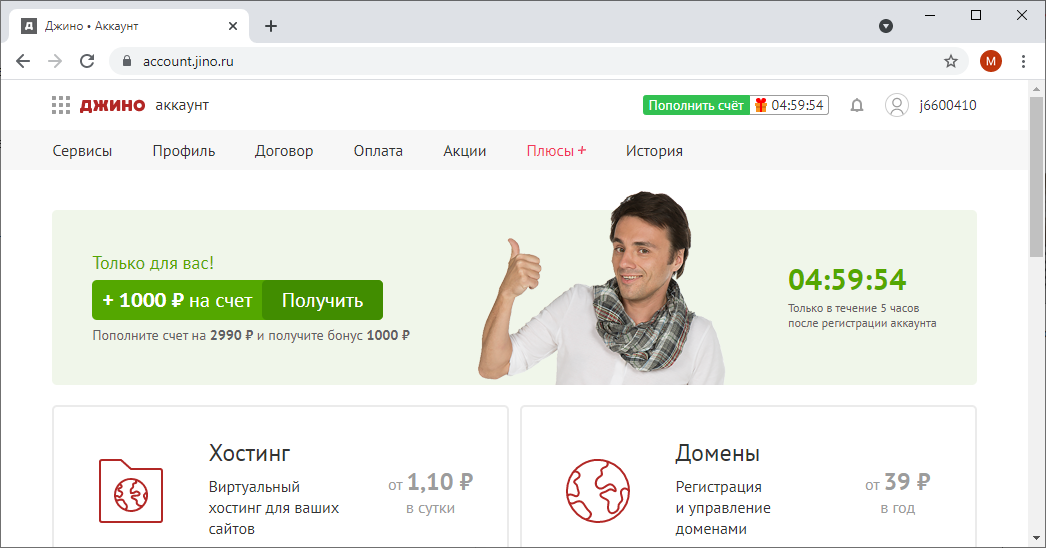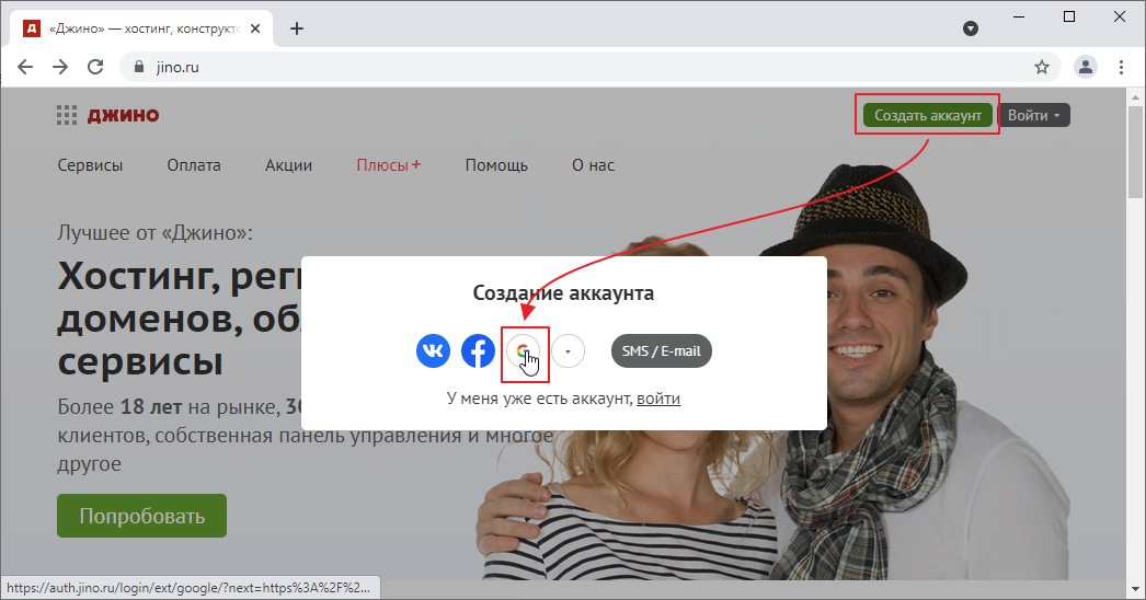 Идем на сайт https://jino.ru/ и кликаем создать аккаунт. У них кстати можно привязать акк к вк, гуглу, фб и не тратить лишнее время на придумывание паролей.