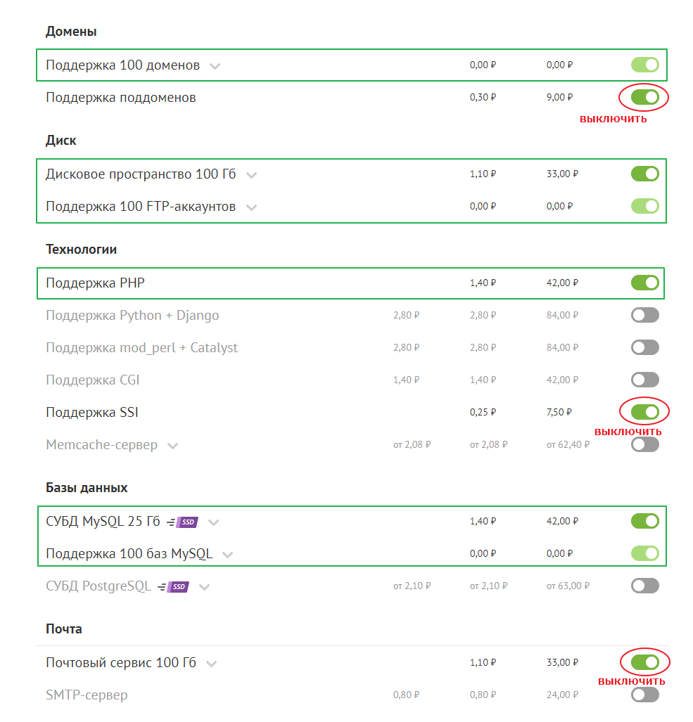 Если же вы захотите сохранить сайт на этом хостинге, то надо будет внести деньги на счет и отключить лишние услуги как на картинке (чтобы перейти на эту страницу надо нажать на кнопку услуги), то есть обведенные зеленым оставляется, обведенные красным выключаете