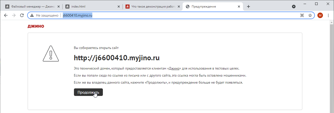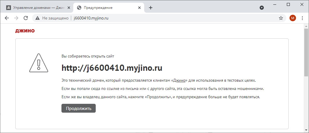 теперь возвращаемся к ссылке на технический домен и тыкаем там кнопку продолжить. Это надо, чтобы предупреждение больше не выскакивало