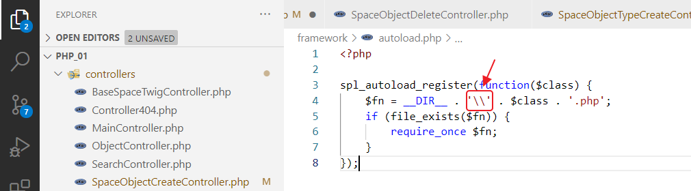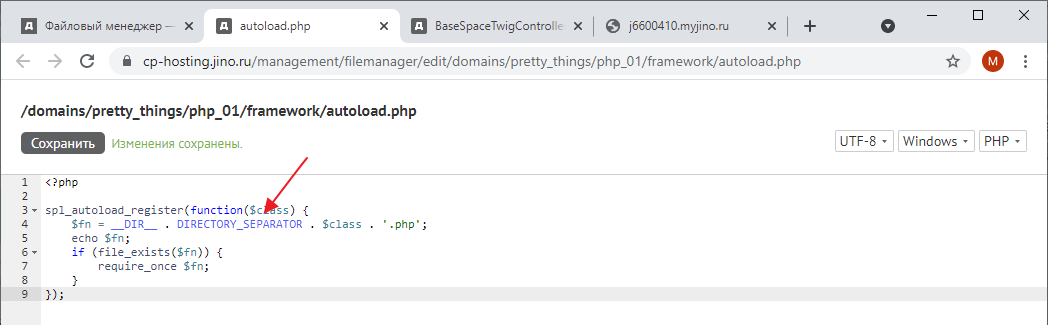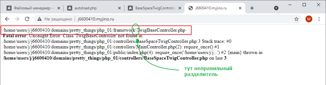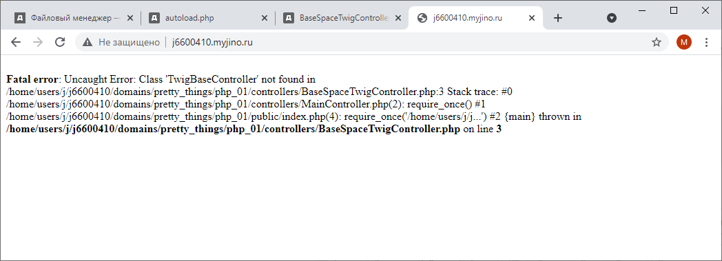 тут написано, что не найден класс TwigBaseController, этот класс у нас должен подгружаться автоматически через autoload, давайте возьмем и прямо на сервере поправим файл framework/autoload.php