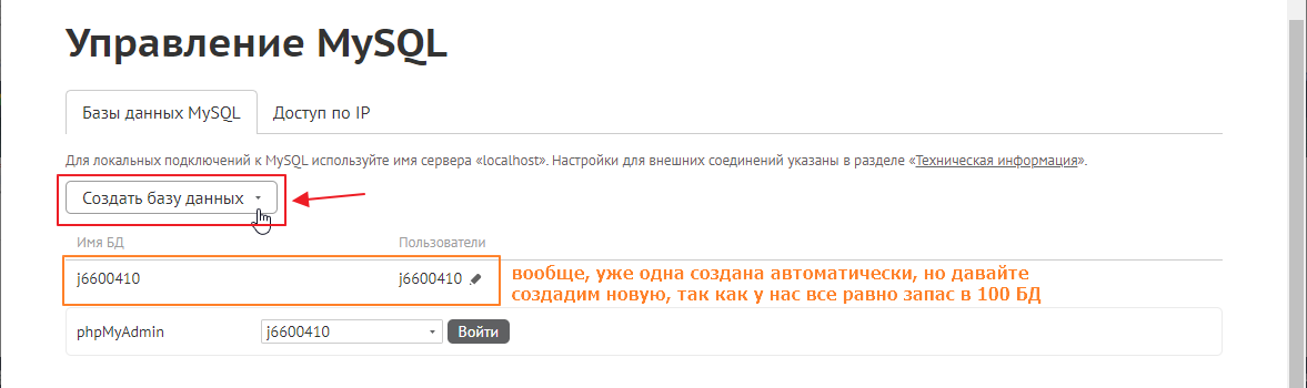 и попадаем в управление базами данных, тыкаем создать базу данных