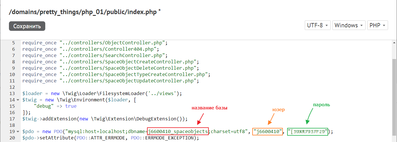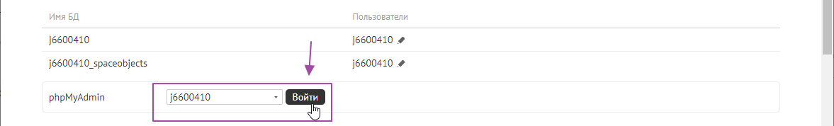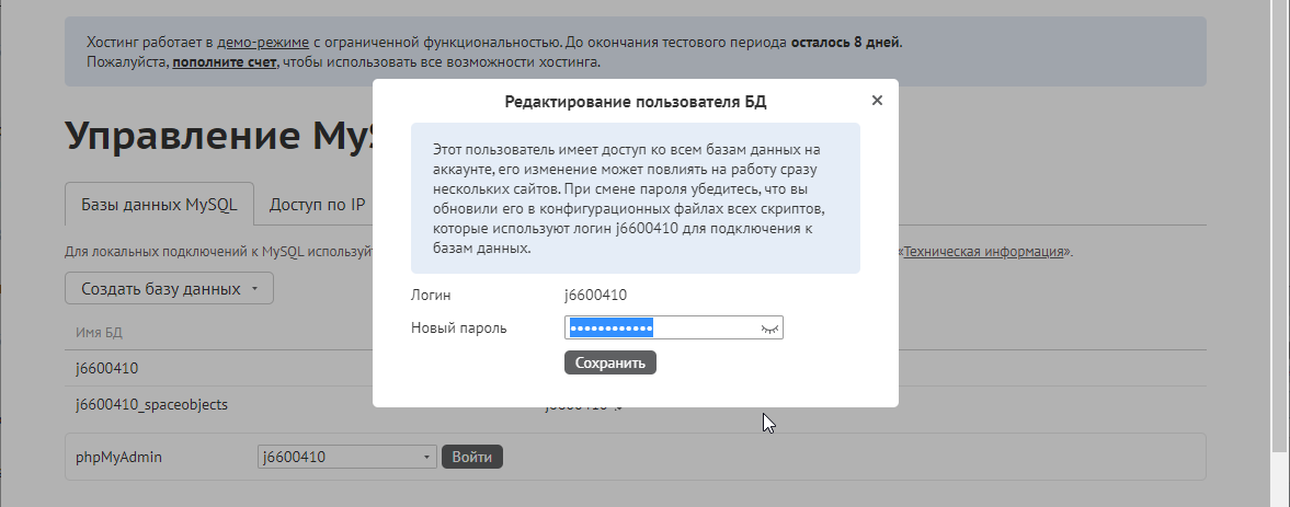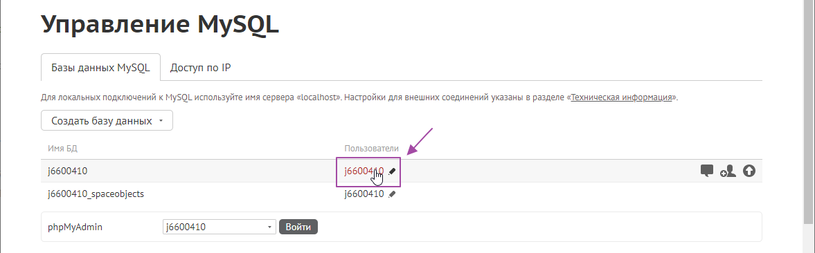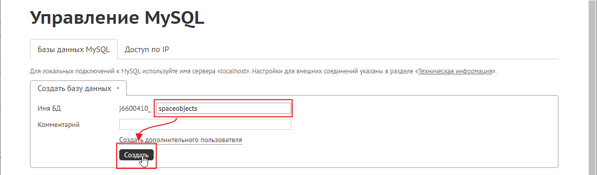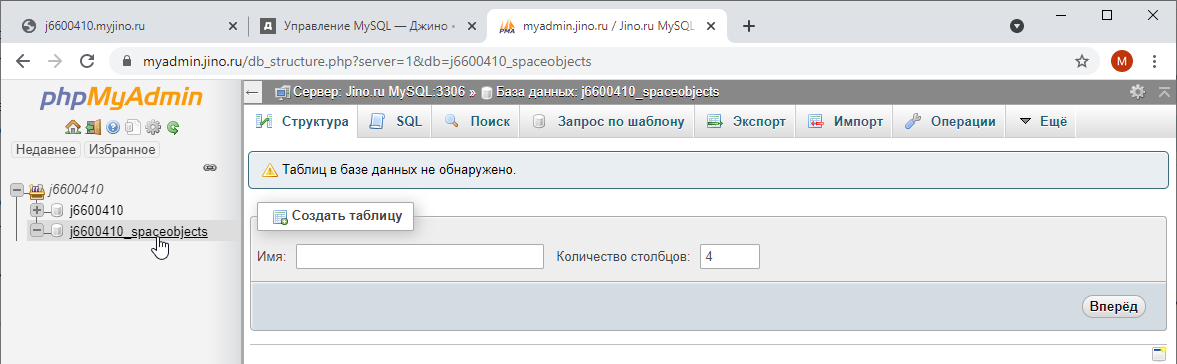 но на самом деле полное имя БД будет с префиксом вашего юзера, т.е. у меня имя будет j6600410_spaceobjects