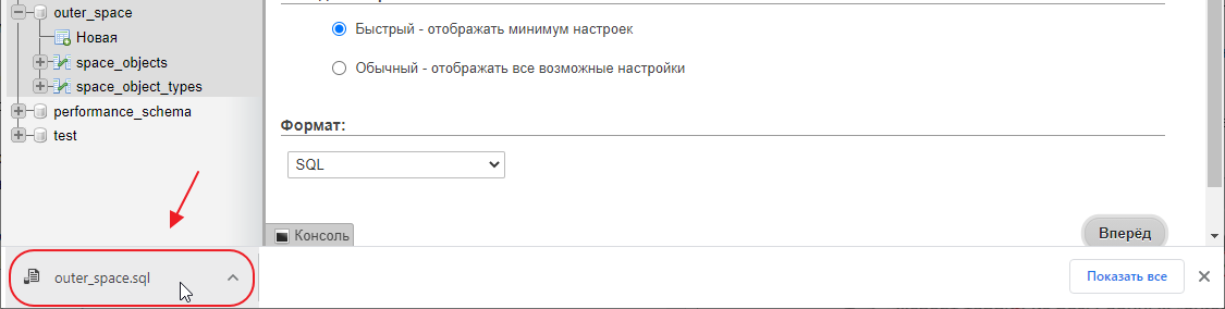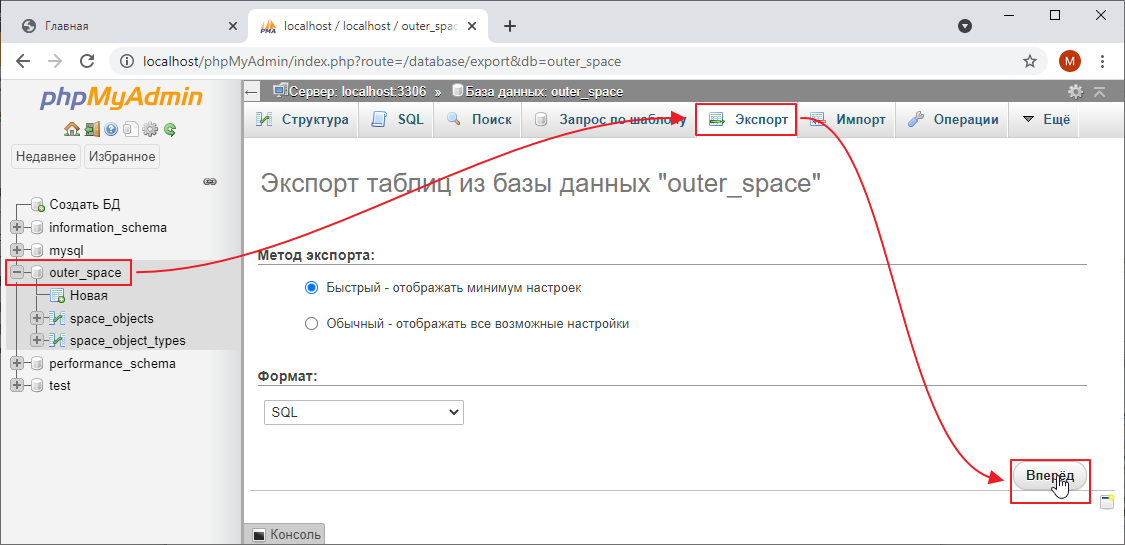 И так заходим в phpMyAdmin который подключен к базе на нашем компе http://localhost/phpMyAdmin/ и идем в экспорт