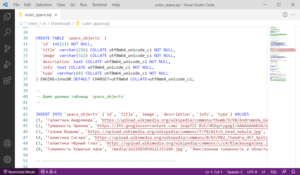если открыть файлик, то увидим SQL-скрипт, в котором есть команды для создания таблиц, а есть команды для заполнения данных
