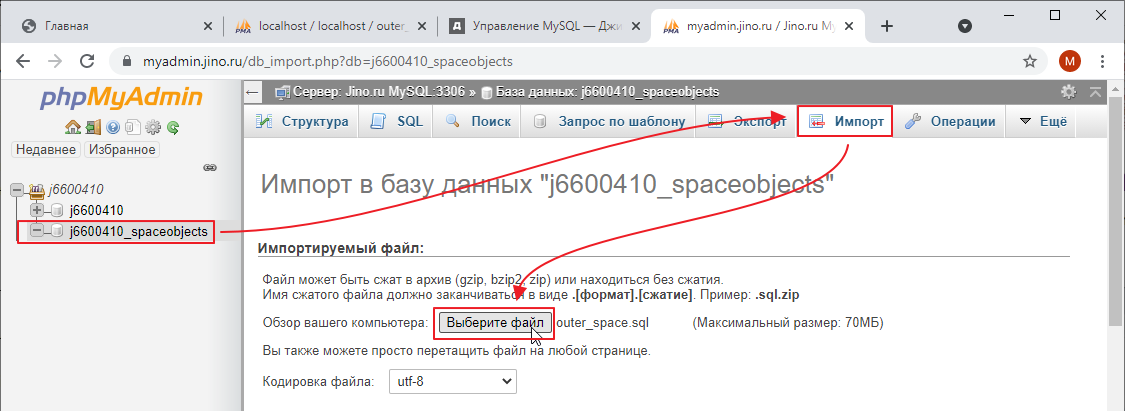 тыкаем нашу базу, тыкаем Импорт и выбираем файл со скриптом